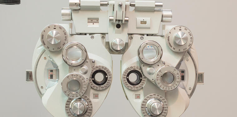Beim Sehtest führen wir zunächst eine Vormessung durch, bevor wir Ihre Augenwerte mit dem Phoropter prüfen. Dabei sitzen Sie bequem auf einem Stuhl, während Sie durch unsere Messvorrichtung auf eine Sehtafel mit Buchstaben und Zahlen schauen. Mit Hilfe des Phoropters wechseln wir Prüflinsen mit unterschiedlichen Sehstärken, durch die hindurch sie die Zeichen auf der Sehtafel erkennen oder eben nicht.